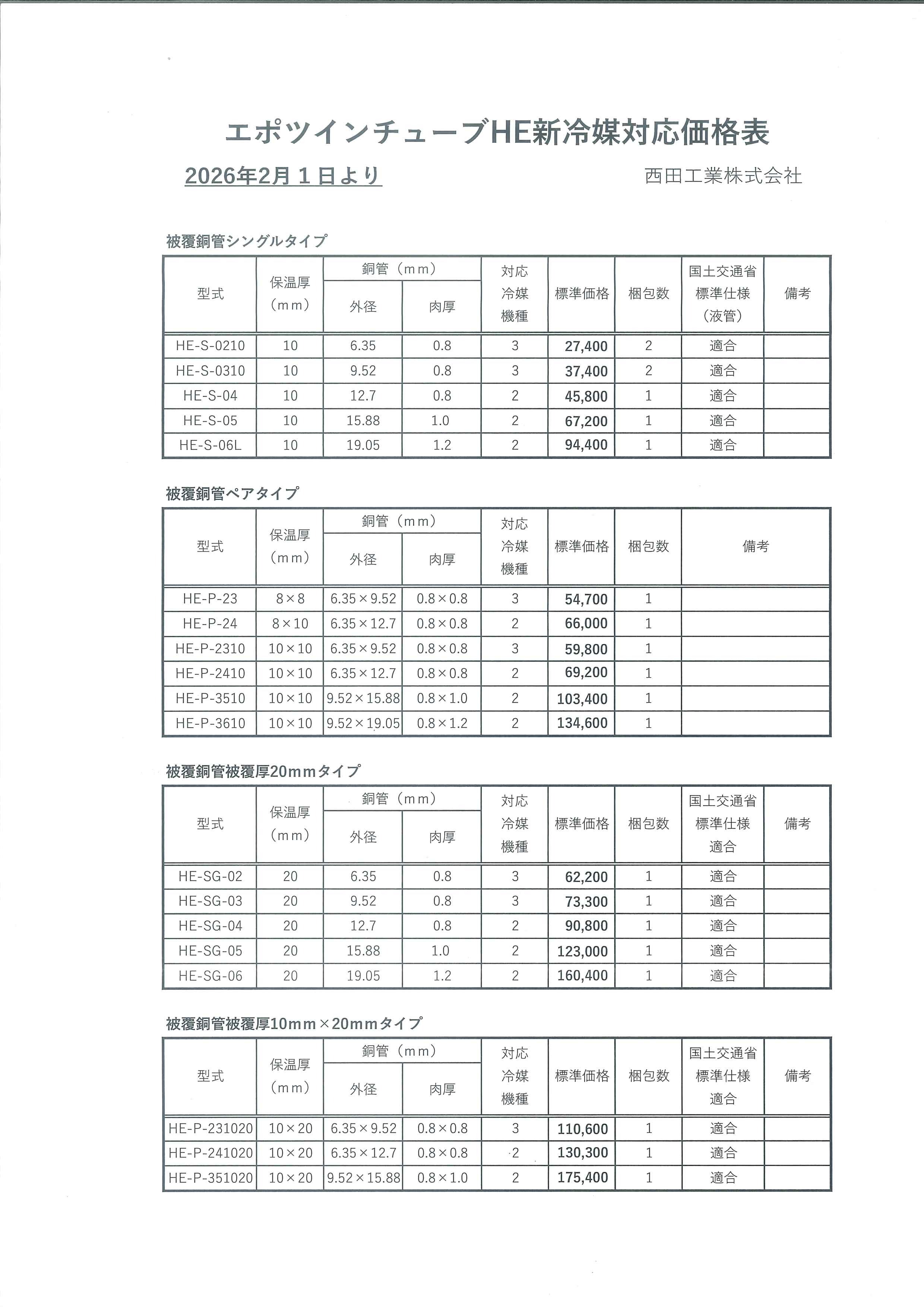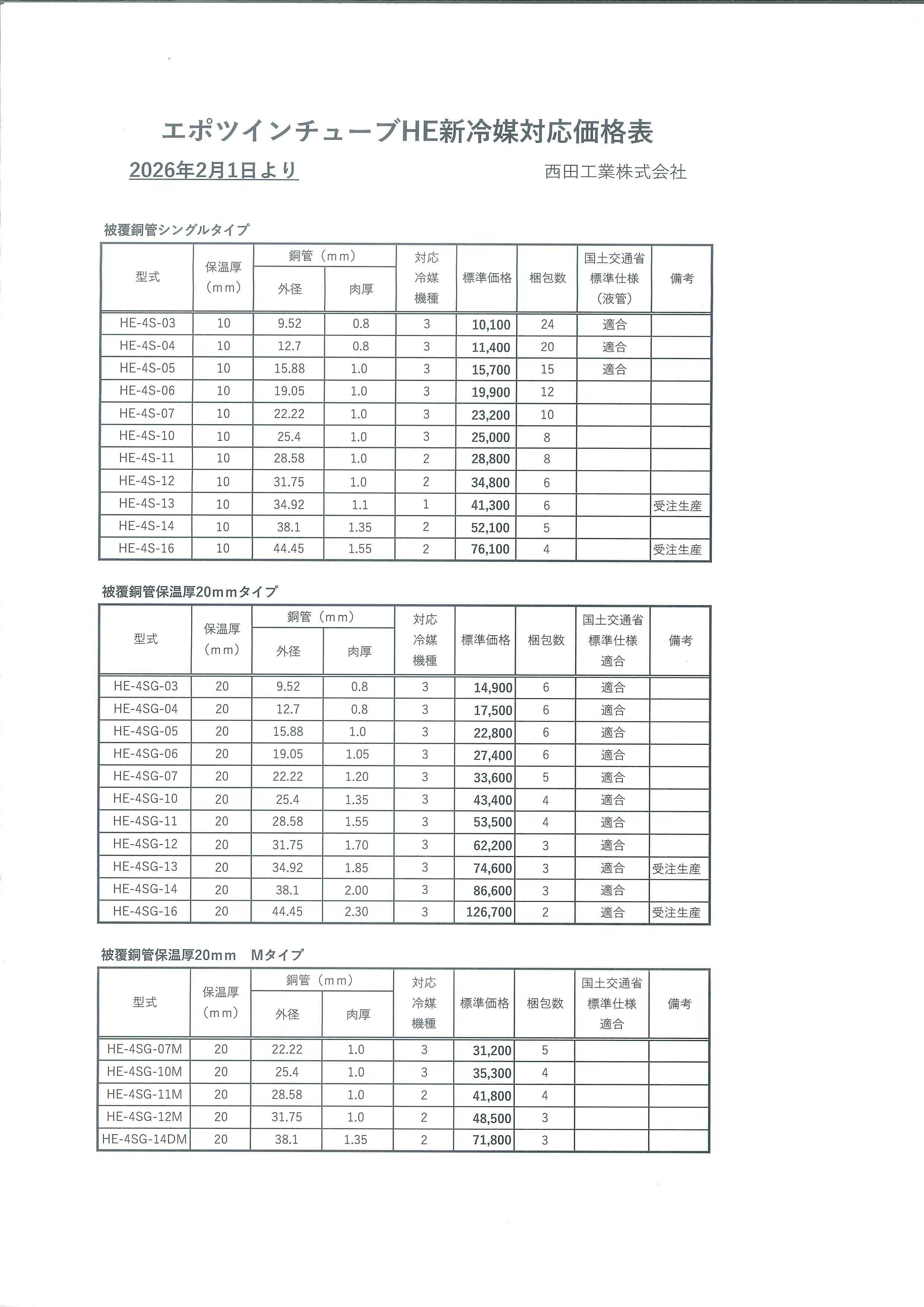 空調用被服銅管(エポツインチューブ)価格変更のお知らせ2026年01月20日 09:592026年2月1日より空調用被服銅管(エポツインチューブ)価格が下記の通り変更となります。HPをリニューアルしました!